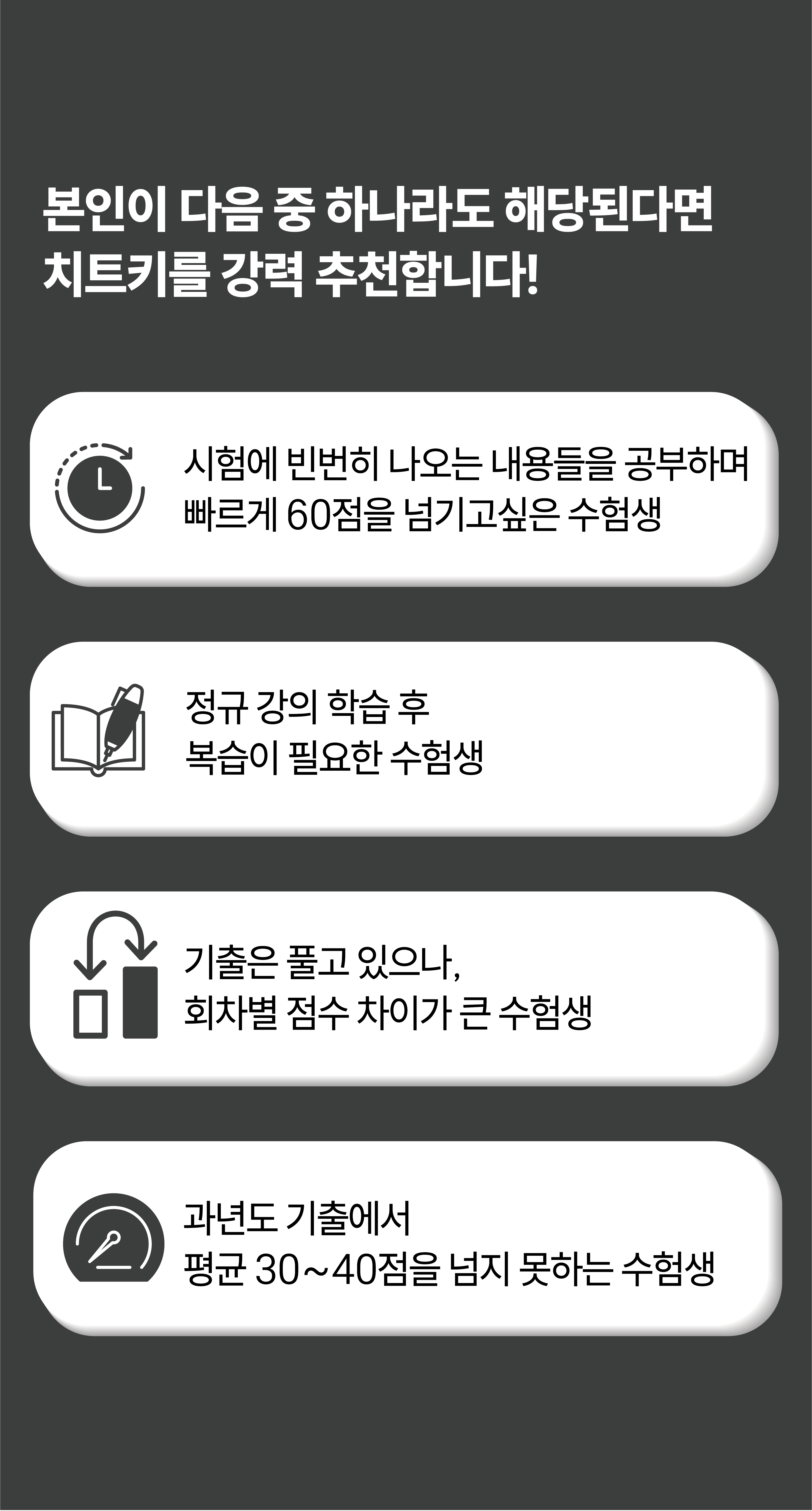 나이는 29살이고 비전공자입니다 전기치트키 책을 사놓기만하고 회사를 다니면서 할 엄두가 안나서 다른공부하였습니다..그러고 회사를 퇴사하고 공부기간은 7월5일부터~8월20일(시험) 바로 전기기사 준비를 하게되었습니다. 시험은 45일 남기고전기치트키 기본교재 3회독 타우 A,B형 3회독 C형 1회독(어려운건 답만 외움) 이렇게 기본을 다진후 유튜브 여러 기출복원 2024 또는 2025년 2회차 까지 ㄱㅅㅎ 복원 및 파이널 특강 3회독 (이것도 도움 많이 받았습니다) , ㅈㄱㅇㄱ(복원) , ㅁㅊㄷ어플 모든 복원을 풀수있을때 까지 2~3회독 한것같습니다. 이게 치트키랑 타우로 기본을 탄탄하게 가지고 나니까 기출 복원문제가 문제만 봐도 어떤식으로 접근해야 하는지 이건 답만 외워야하는 문제랑 풀수있는 문제랑 확실히 구분했습니다.헷갈리거나 틀린문제만 정리하여 방 거실 화장실 정수기에 포스트잇을 붙여가며 수시로 틀린부분에 대해서만 반복 또 반복해서 봤습니다(저는 오답노트 만들기가 귀찮아서 포스트잇을 활용했습니다.) 일단 필기를 합격해야 실기가 있는거니까 어려운 문제까지 가져간것같습니다.각각 강사님들 혹은 다른 출판사마다 다른 풀이 방법이 있는데 저에게 맞는 풀이방법을 찾아서 풀었습니다.근데 그게 어떻게 하면 쉽게 풀수있는지가 저에게 맞는 풀이방법이였습니다. 시험은 총 2시간 30분인데 1시간 10분만에 문제가 다 풀리더라구요결론은 이 전기기사의 진입장벽을 낮춰주는건 치트키만한게 없는것 같고 나머지 제가 언급해드린 복원문제는 어느정도 실력이 없으면 따라가기 힘든수준입니다문제풀이가 워낙 간소화하고 이미 알고있는 내용은 자세한 설명은 없으니깐요 저는 어떻게 하면 필기를 합격할수있는지 깨달았습니다기본이 가장 중요합니다 기본이 없으면 복원문제 5회독 해도 의미 없습니다 다시한번 강조하면 전기치트키 교재는 이 기본에 충실하고 핵심내용만 추려놓은 이름바 고농축 수액과도 같다고 생각합니다.저는 이것을 기반으로 최신CBT 문제위주와 복원문제를 막힘없이 풀 수 있었습니다. 기본 하루 평균 8시간이상 공부했습니다사실 운이 좋았던것도 있습니다 복원문제에서 거의다 나오긴했습니다만 복원문제만 주구장창 푼다고 해서 합격하는것도 아니고 치트키와 타우로 실력을 쌓은 후 2024~2025년 여러 복원을 보시길 바랍니다복원도 같은 2025년 2회차인데 복원문제가 거의 다르기 때문에 복원문제는 필기를 안정적으로 합격하는데 도움을 줄것입니다(과락방지) 3회차 복원도 물론 다 챙겨서 갔습니다.(ㄷㅅㅇㄷ, ㄱㅅㅎ, ㅈㄱㅇㄱ) 실기가서 개고생하기보다 치트키로 실기 기본도 같이 잡아준다 생각하시고 제가 공부한 루트대로만 한다면 필기는 불합격 하기 힘든시험일 것입니다.저처럼 확실한 합격보장을 원하시면 이 방법을 추천드리고.. 그래도 필기합격해도 실기가 문제아니냐 하시는분들은 70점대까지의 점수만 확보하시고 필기와 연계되는 실기 기초 강의 듣는걸 추천드립니다.글을 너무 두서없이 써서..양해 부탁드립니다전기치트키 교재와 타우교재 만들어주셔서 정말 감사합니다. 오장육부+타우린 드가자!!